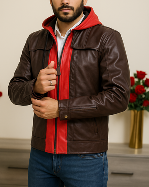 Brown and red come alive in a symphony of style, a unique pairing that reflects passion grounded in strength. It’s for the man who walks between order and chaos, elegance and edge. The hooded design adds versatility while turning casual looks into powerful statements. This is more than a jacket. It's the armor of ambition.