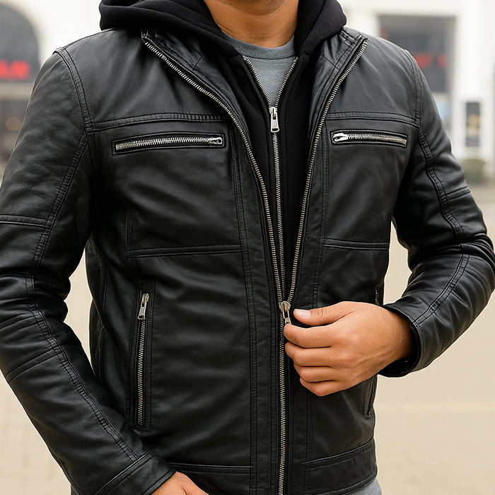 Hooded black leather jacket for men's, removable hood jacket