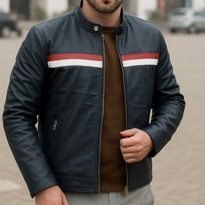 Blue leather jacket for men's with race winning line
