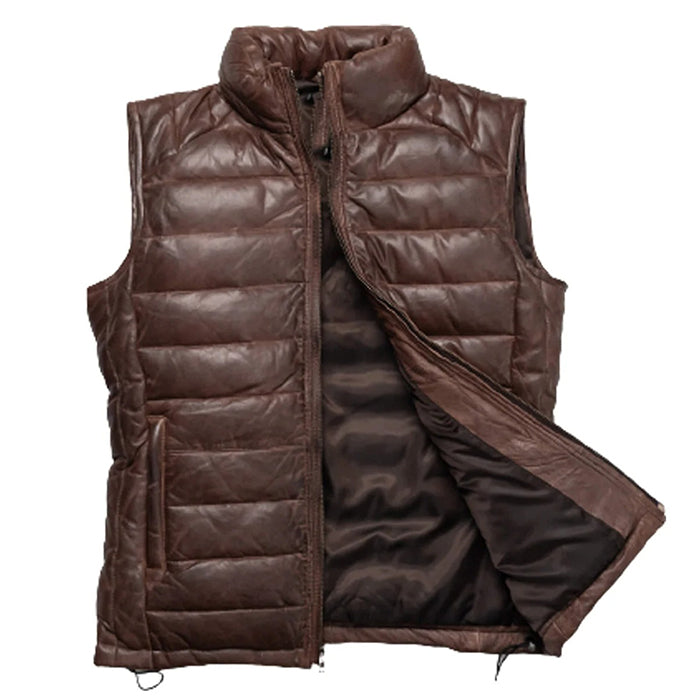 Brown Leather Puffer Vest for men's