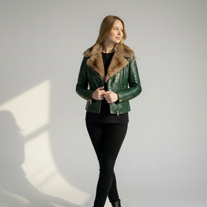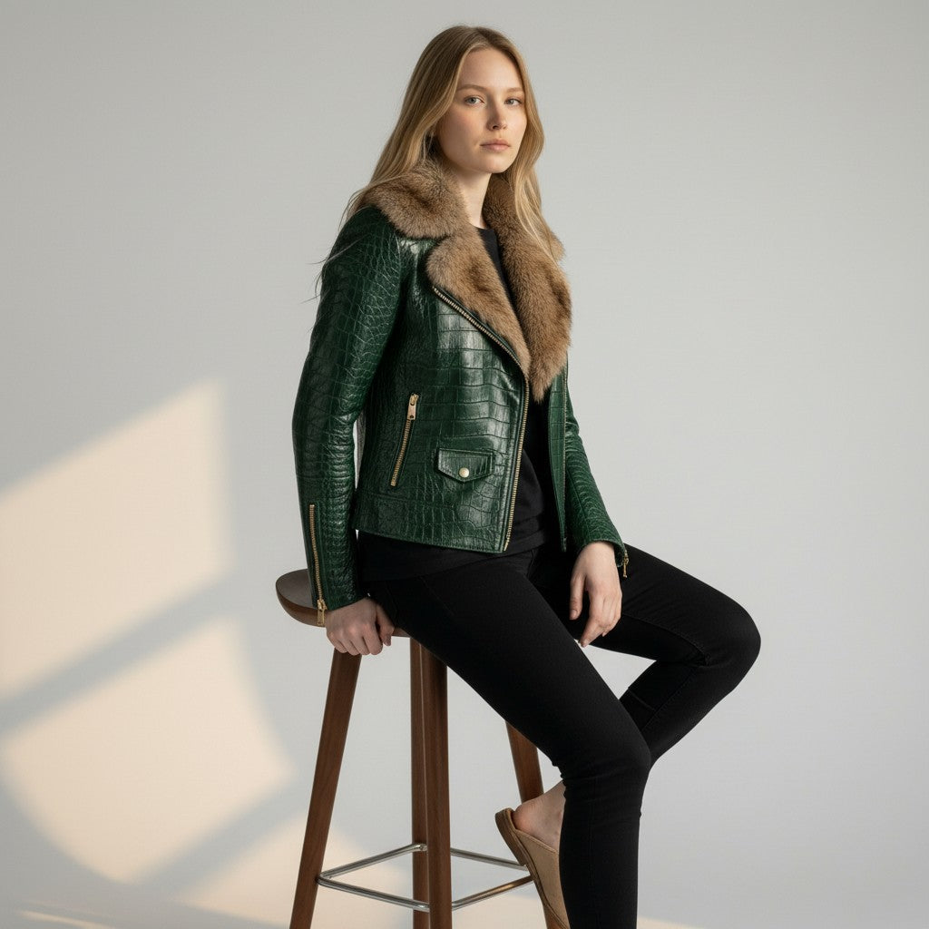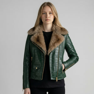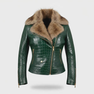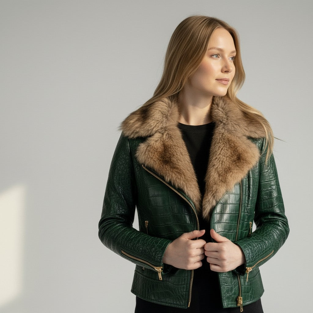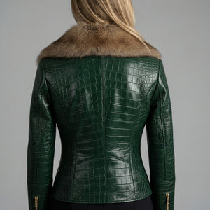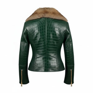 Turn heads with this olive green crocodile-embossed leather jacket featuring a luxurious fur collar. Crafted from premium genuine leather, this statement piece combines bold texture with a sleek, flattering fit.